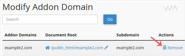 3. Locate the addon domain under Modify Addon Domain and click on Remove.